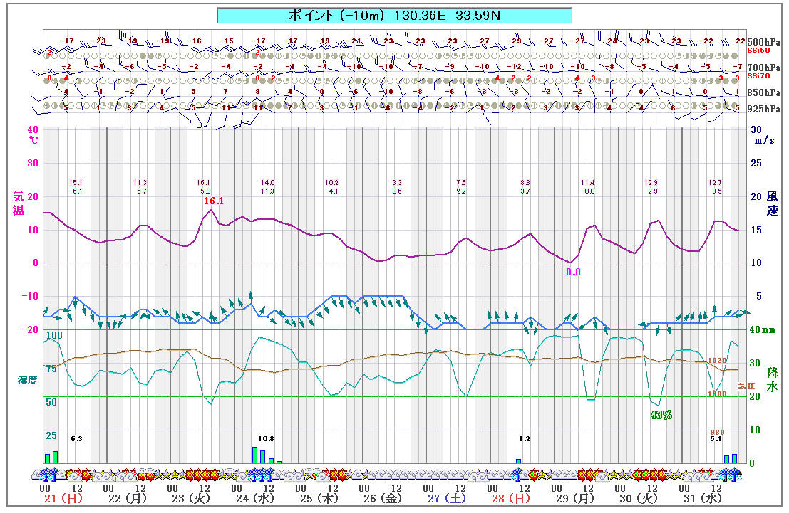 日本ソフト技研で販売している『APLA』を利用して、気象庁の数値データを10日間に渡りグラフ化しています。普段見慣れた天気予報と違い、気温の動きや風の強さを連続して確認することができます。ちょっと先のお出かけ計画を立てる時の参考にして下さい。