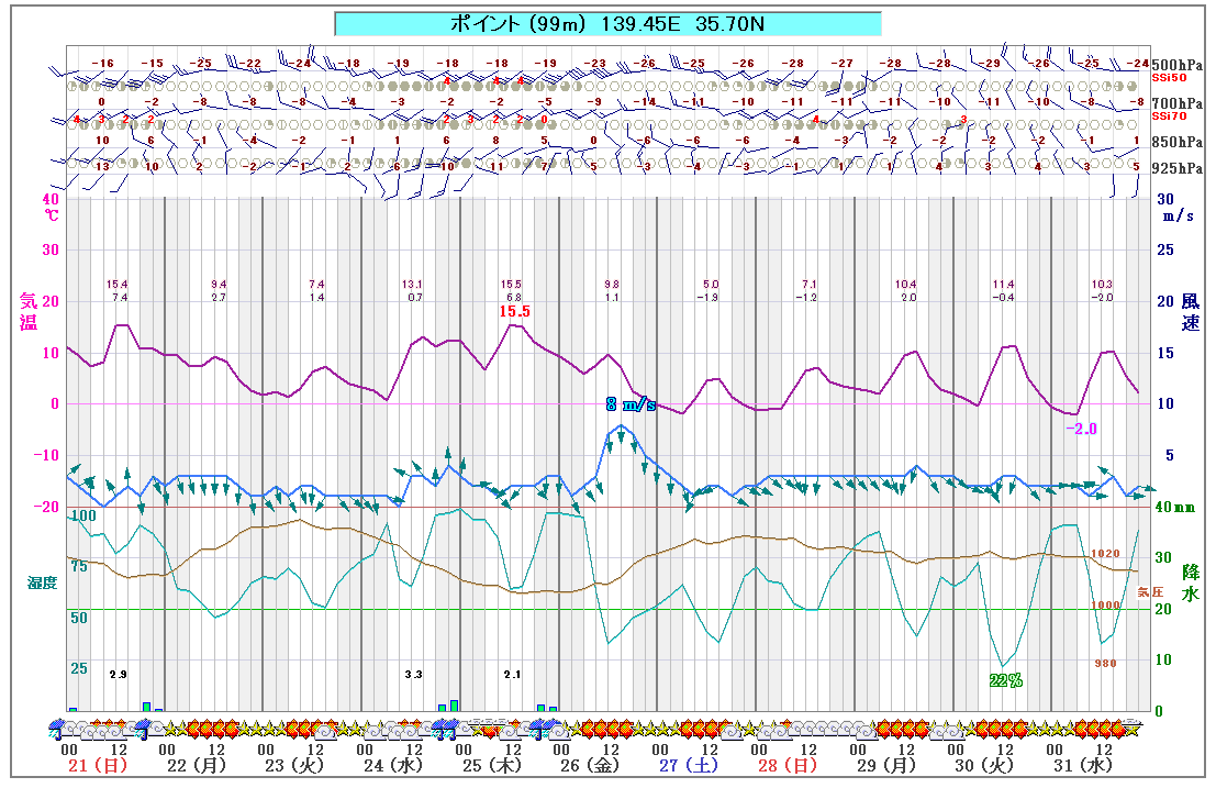 日本ソフト技研で販売している『APLA』を利用して、気象庁の数値データを10日間に渡りグラフ化しています。普段見慣れた天気予報と違い、気温の動きや風の強さを連続して確認することができます。ちょっと先のお出かけ計画を立てる時の参考にして下さい。