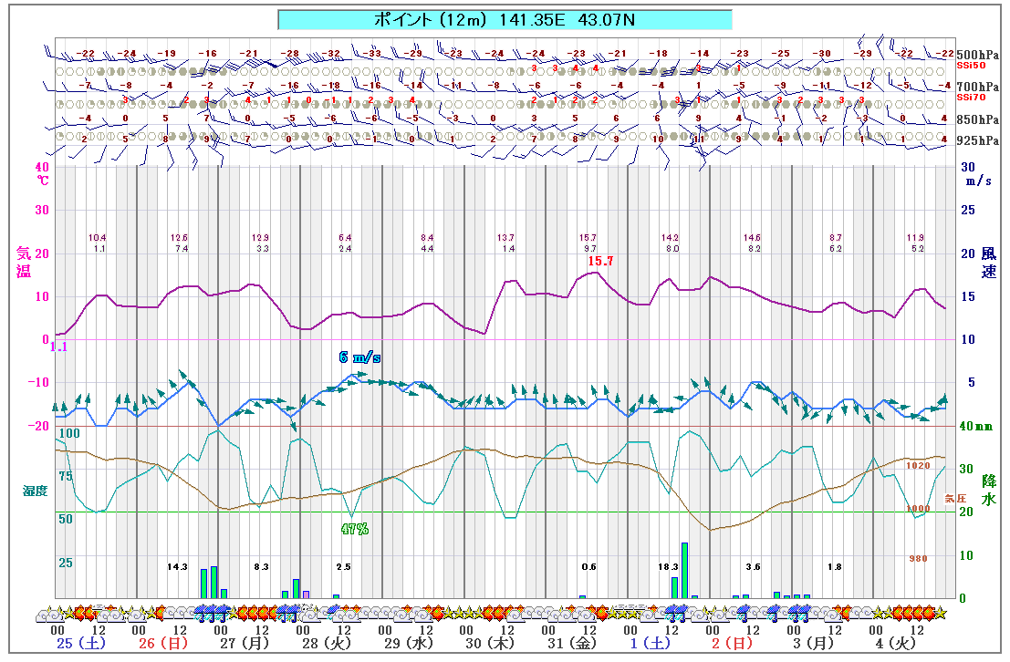 日本ソフト技研で販売している『APLA』を利用して、気象庁の数値データを10日間に渡りグラフ化しています。普段見慣れた天気予報と違い、気温の動きや風の強さを連続して確認することができます。ちょっと先のお出かけ計画を立てる時の参考にして下さい。