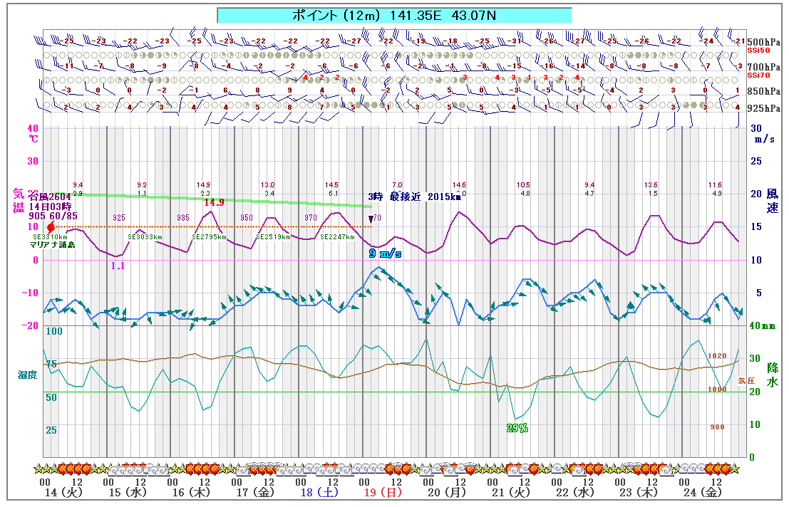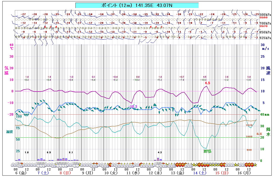 日本ソフト技研で販売している『APLA』を利用して、気象庁の数値データを10日間に渡りグラフ化しています。普段見慣れた天気予報と違い、気温の動きや風の強さを連続して確認することができます。ちょっと先のお出かけ計画を立てる時の参考にして下さい。